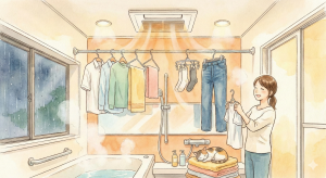 ここまでは「暖かさ」と「安全性」についてお伝えしましたが、浴室換気暖房乾燥機の魅力はそれだけではありません。名前に「乾燥」とある通り、一年中を通して家事を楽にしてくれる頼もしいパートナーにもなります。